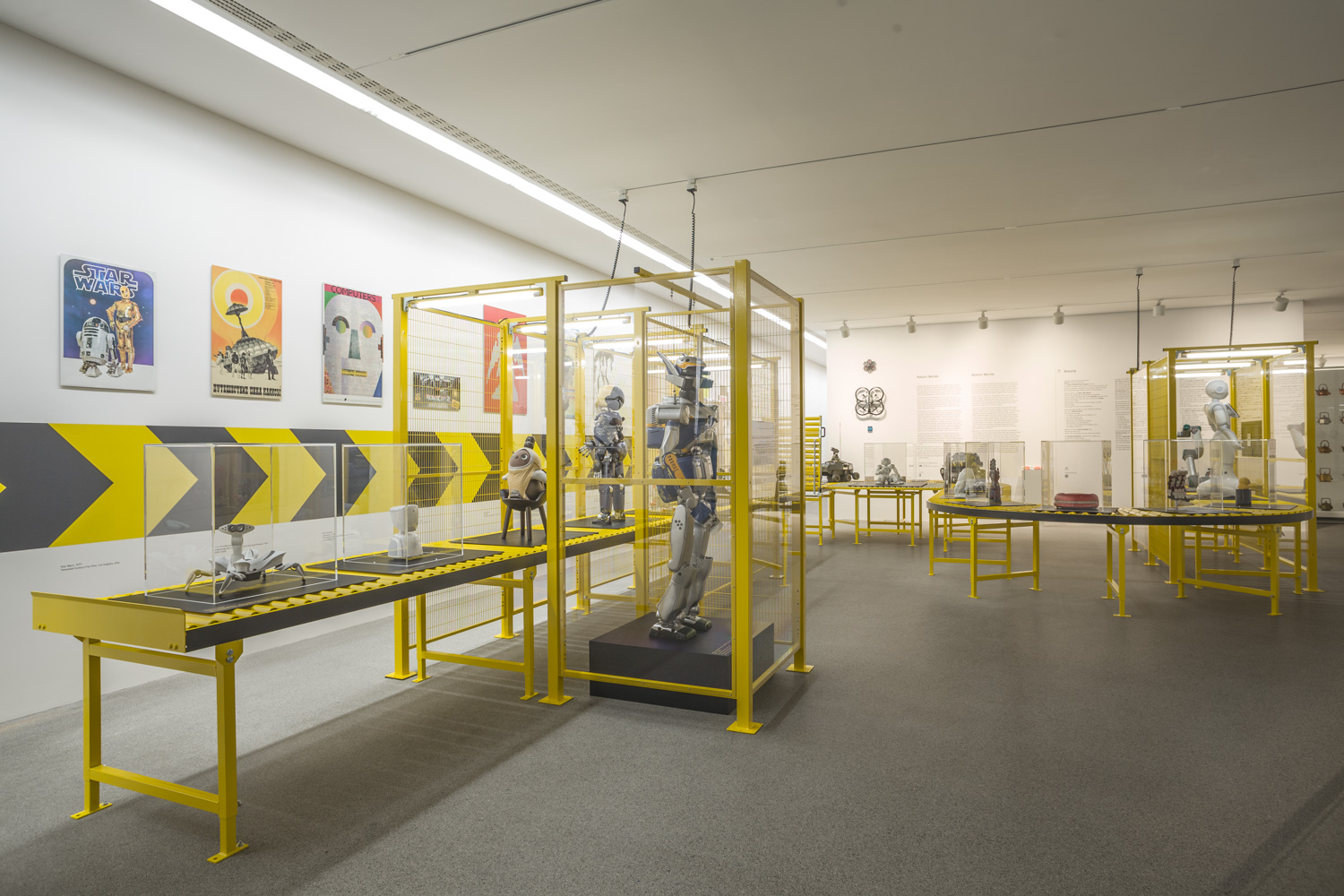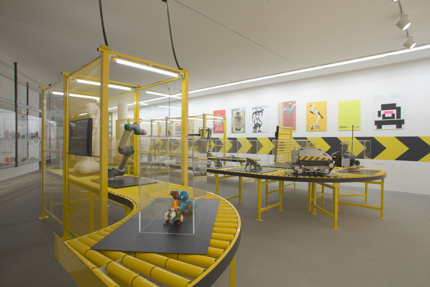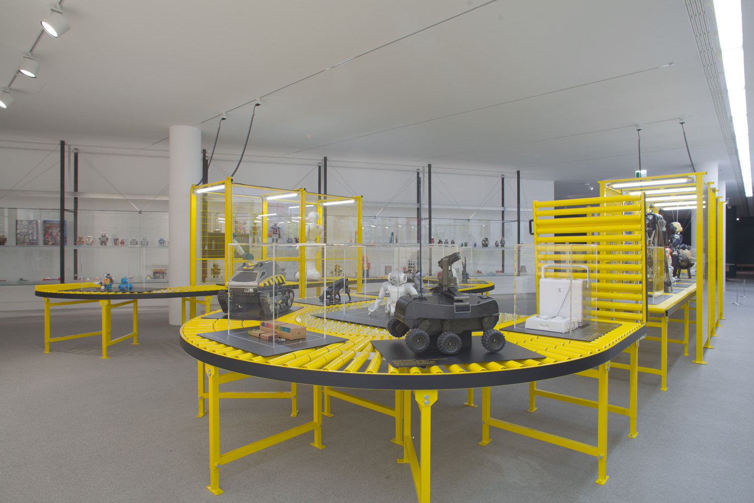Die Installation zeigt, wie industrielle Fördertechnik in einer musealen Umgebung zu einem architektonischen Element wird, das Besucherinnen und Besucher durch die Welt der Robotik führt.
